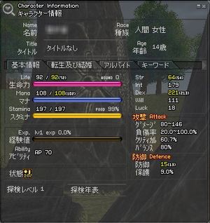 撮影日2008/09/18 ジャッカルを着るために、17歳転生を目指してた頃の産物ですね。 この頃は純弓士だったのでINTもSTRも全然ない頃です。 DEXもない? 違うんだ、必死に上げてる途中だったんだ……!( AP70とか今じゃありえませんね……。 0がデフォ(´・ω・`) |