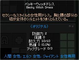 撮影日:2008/10/01 初めてフィールドボスで出た当たり品。 ベッキーは知り合いの方から既に1着貰っていたので、 これは売りに出しました。 確か1.8Mぐらいで……今じゃありえませんねえ。 |