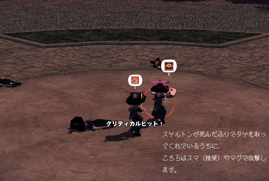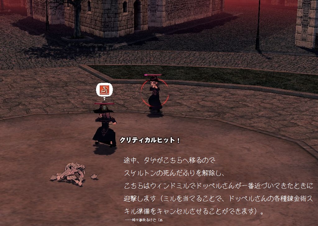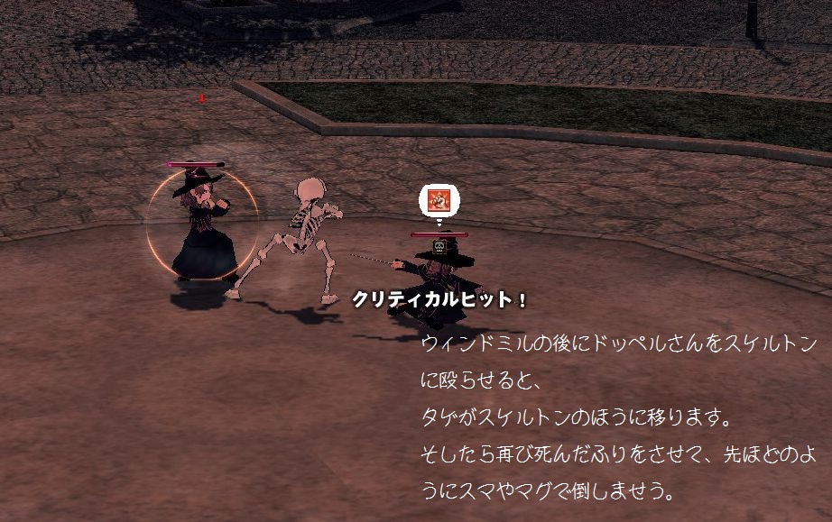 タゲがスケルトンから逸れた隙に、スケルトンの死んだふりを解除し、ドッペルさんを殴らせておきます。 |